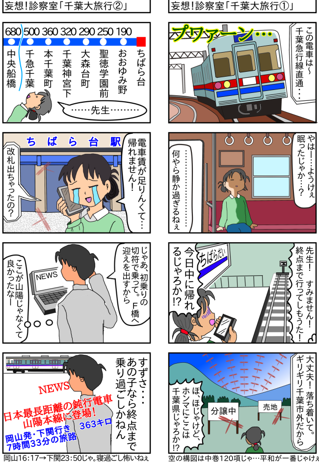 漫画内では「千葉急行線が経営破綻しておらず、京成との乗り継ぎ割り引きも存在しなかった場合」の運賃を描いています。昔の市販の時刻表には、千葉急行線と京成線との乗り継ぎ割り引きの言及が有りません。京成千葉線のスペースに、上野から、ちはら台までの運賃が書き込めるスペースが開いているのに空欄になっています。1998年当時の千葉急行+京成線の運賃を合算すると、上野~ちはら台は930円となります。ちはら台駅の手前で、千葉市の隣りの市原市にギリギリ入りますので、ちはら台はギリギリ「千葉市外」の位置です。